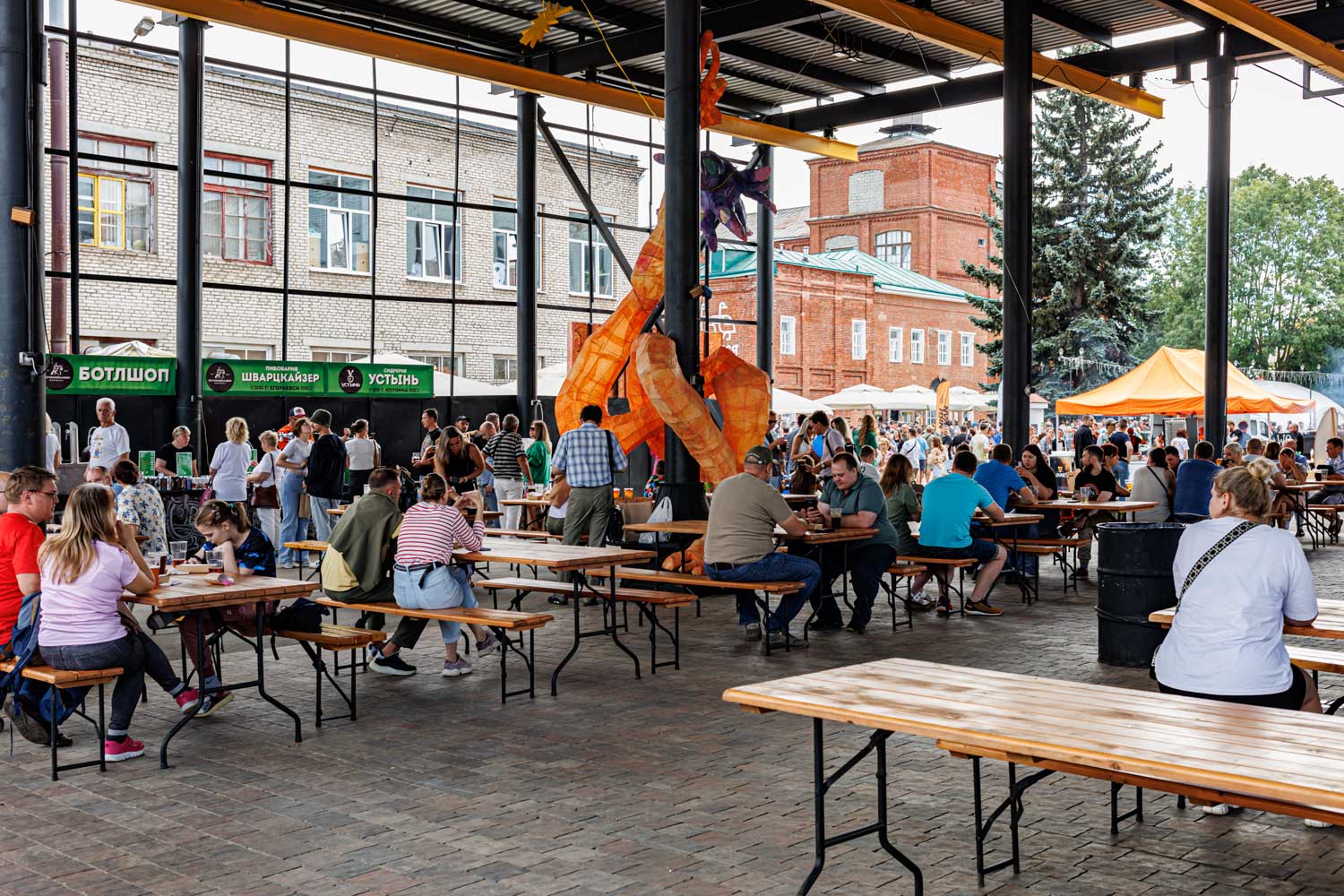 В субботу 24-го августа, кроме двух крафтовых фестивалей в Москве и Казани, прошел еще "народный" пивной фестиваль в Коломне, организуемый пивоварней "Шварцкайзер". Прошел он в арт-квартале "Патефонка" (центра города, по пути от ж. д. станции к Кремлю) и пожалуй собрал значительную часть населения города. Кроме "Шварцкайзера", было представлено пиво от "Глетчера", "Жигулевского пивзавода" и сидры от "Устынь". Вход на фестиваль был бесплатным, а на пиво (а также и на безалкогольные напитки) действовала жетонная система - один жетон - 100 рублей. Большинство пива предлагалось по 3 жетона (а баночное и по 4), что в общем-то не могу назвать дешевым. Закуска была представлена ресторанами сети "Шварцкайзер", да и не только - так что можно было и дешево поесть куриные голени или дорого - например осетров горячего копчения. Фестиваль был именно для народа, так что значительная его часть была отдана для увеселения детей, которых казалось было не сильно меньше чем взрослых (привет фестивалю пива в Чебоксарах, куда детей не пускают). Имелось достаточное количество столиков, при чем под крышей, так что дождя можно было не опасаться (да его и не было). У сцены происходили различные розыгрыши и соревнования, а под вечер выступали кавер-группы. По всей территории "Патефонки" проходила выставка тюнингованных (или ретро) автомобилей - Gragon fest. Небольшие очереди к пивоварам или к шатрам с закусками возникали, но долго ждать не приходилось (с туалетами тоже проблем не было). В общем народ веселился во всю.
