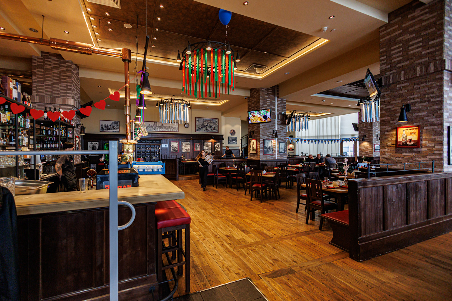 Порадовало и пиво - "Hell" - чистый, солодовый и солод отличный, от этого легкие земляничные тона. "Hefe-weissbeer" - очень ровное пшеничное пиво, выброженное, с классическим вкусом банана и гвоздики. "Dunkel" - со вкусом темных и карамельных солодов, а также сухофруктов. И к Октоберфесту был сварен сорт Marzen / Oktoberfest - умеренно полный и плотный, но с богатым солодовым вкусом. Цена на пиво - 390 р. за поллитровый бокал, кстати днем и поесть не дорого, так супчик входивший в бизнес-ланч - всего 180 р.! |