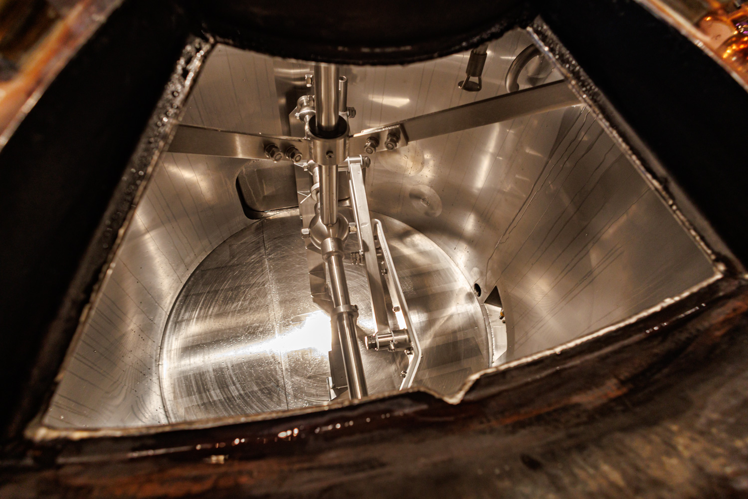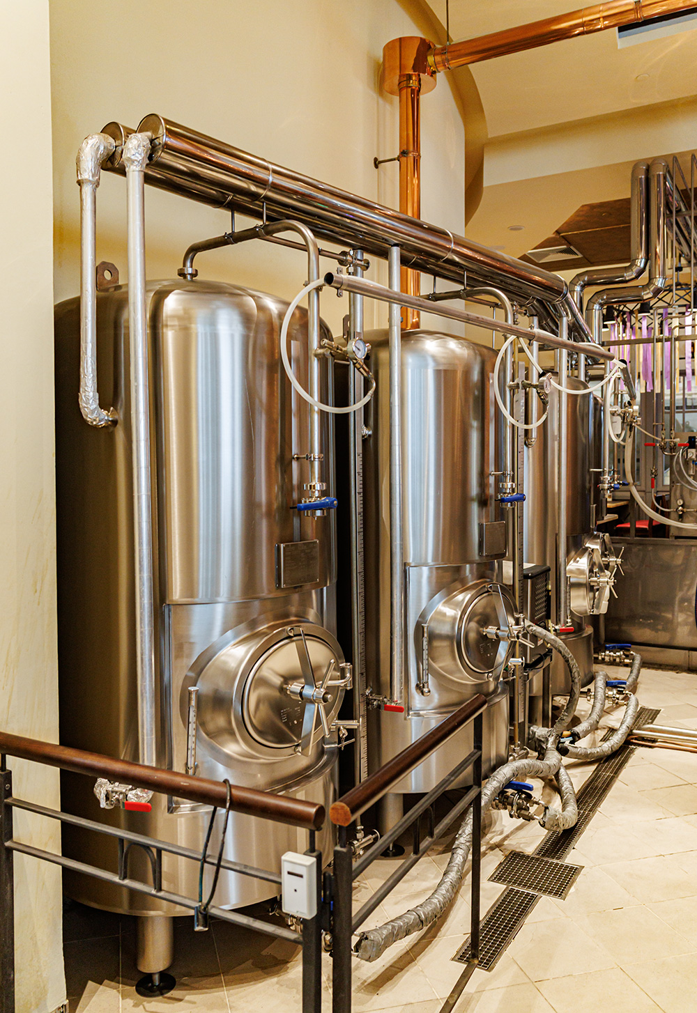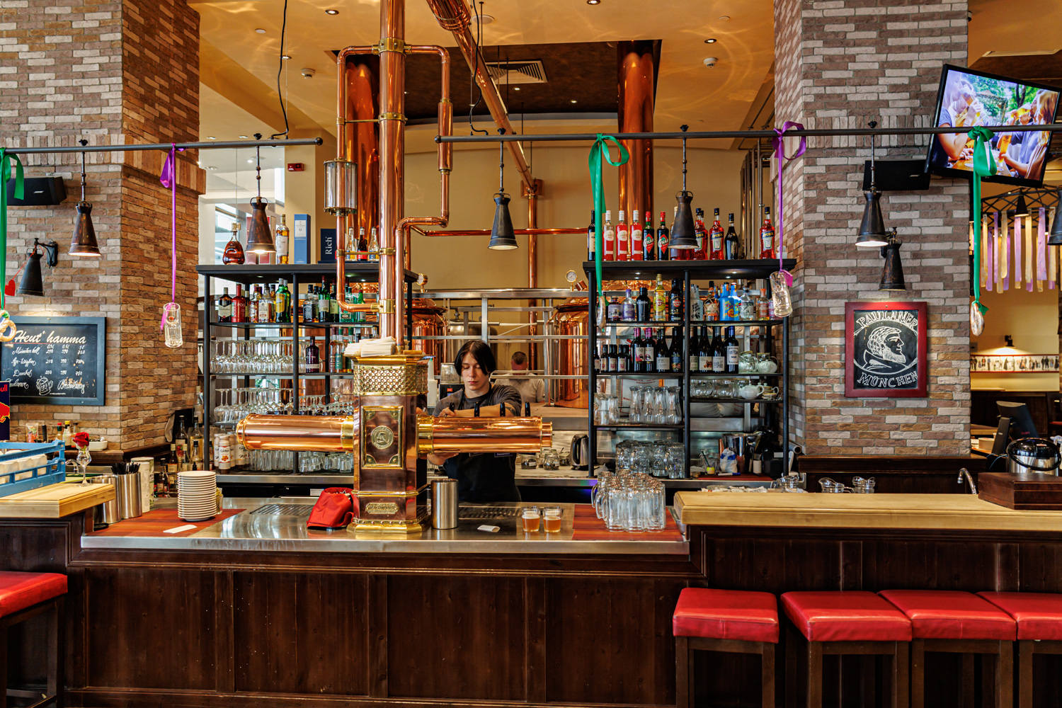 Совсем рядом с Maximilian's, на той же улице Труда (но дом 179) расположен ресторан-пивоварня еще одной сети - Paulaner brauhaus (в здании Radisson Blu Hotel). Тоже посетил не один такой Paulaner и тоже могу сказать что челябинский - один из лучших. Интерьер ресторана вполне типичный, в стиле баварских пивных, посреди большого зала, за стойкой, установлен варочный порядок пивоварни от компании Caspary, отделанный медью и начищенный до блеска. Удалось посмотреть не только варочник, Максим Сапожников, главный пивовар, провел экскурсию и по цеху брожения. Брожение проводится в открытых танках, что встретишь не так уж часто, дображивание в закрытых вертикальных емкостях.