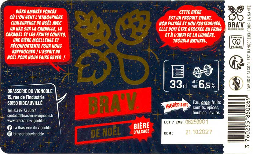 Bra'v - La Brasserie du Vignoble, "Bra'V de Noël" (Winter Ale) - типичное зимнее пиво - карамельные и темные солода и немного пряностей вроде корицы. Как Kraft Point Mulhouse, "Mariage Forcé" (Blonde / Golden Ale - Other) - по стилю это скорее грейп-эль, здесь добавлено вино (или виноградный сок), вкус потому блонда, но с тонами белого вина. Немного сладковато. |