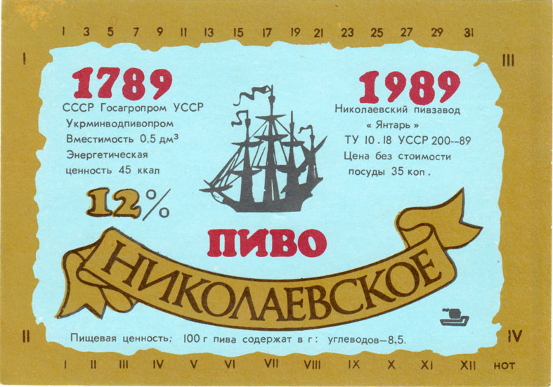 Цветность: светлое Плотность: 12% Крепость: Вкус: Цена: 35 к. ГОСТы: ТУ 10-18 УССР 200-89 Рецептура: Производители: Николаевский ПЗ Период производства: с 1989-го г. Примечания: сварен к 200 летию Николаева.